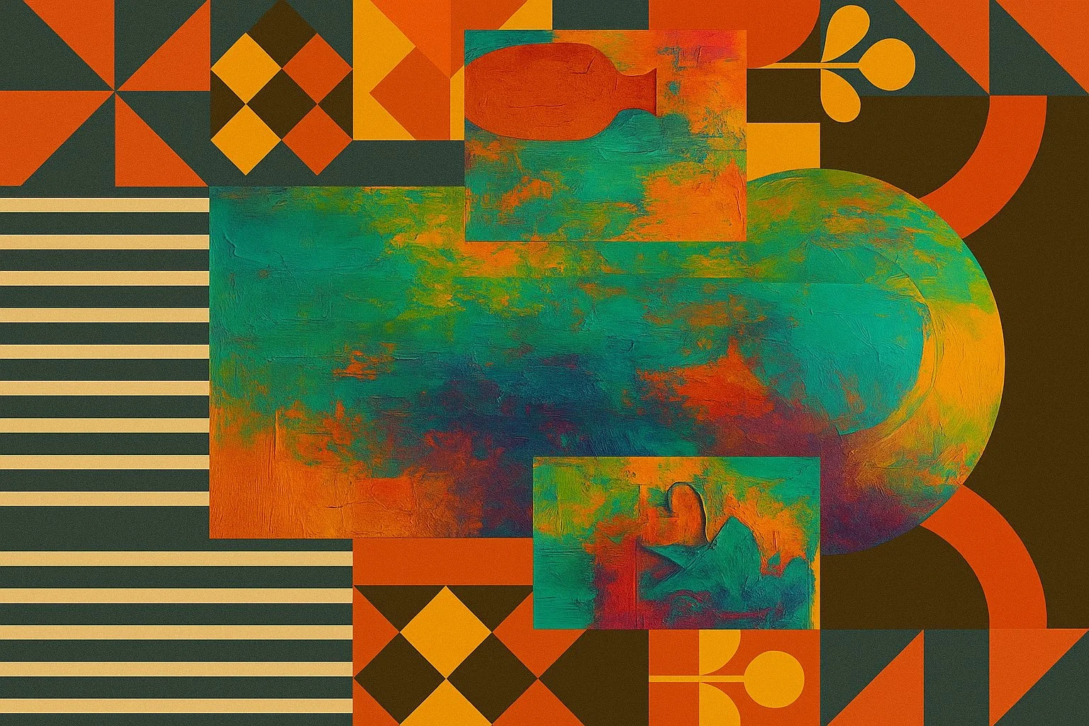 Colorful abstract geometric pattern with shapes like circles, squares, waves, leaves, and lines in orange, green, black, and teal.